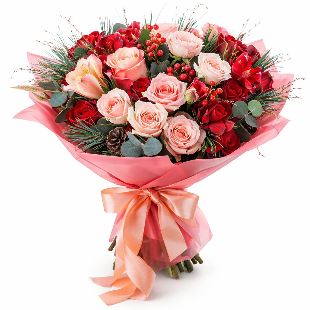 Яркие оттенки розового и персикового создают атмосферу праздника. В букете представлены персиковые одноголовые розы, розовые и красные кустовые розы, красные альстромерии, гиппеаструм, аспидистра, эвкалипт и шишки. Упаковка выполнена из матовой плёнки и атласной ленты, придающей букету особую изысканность. Эта композиция создаёт атмосферу торжества и подходит для поздравления коллеги с повышением, особенно для женщины.