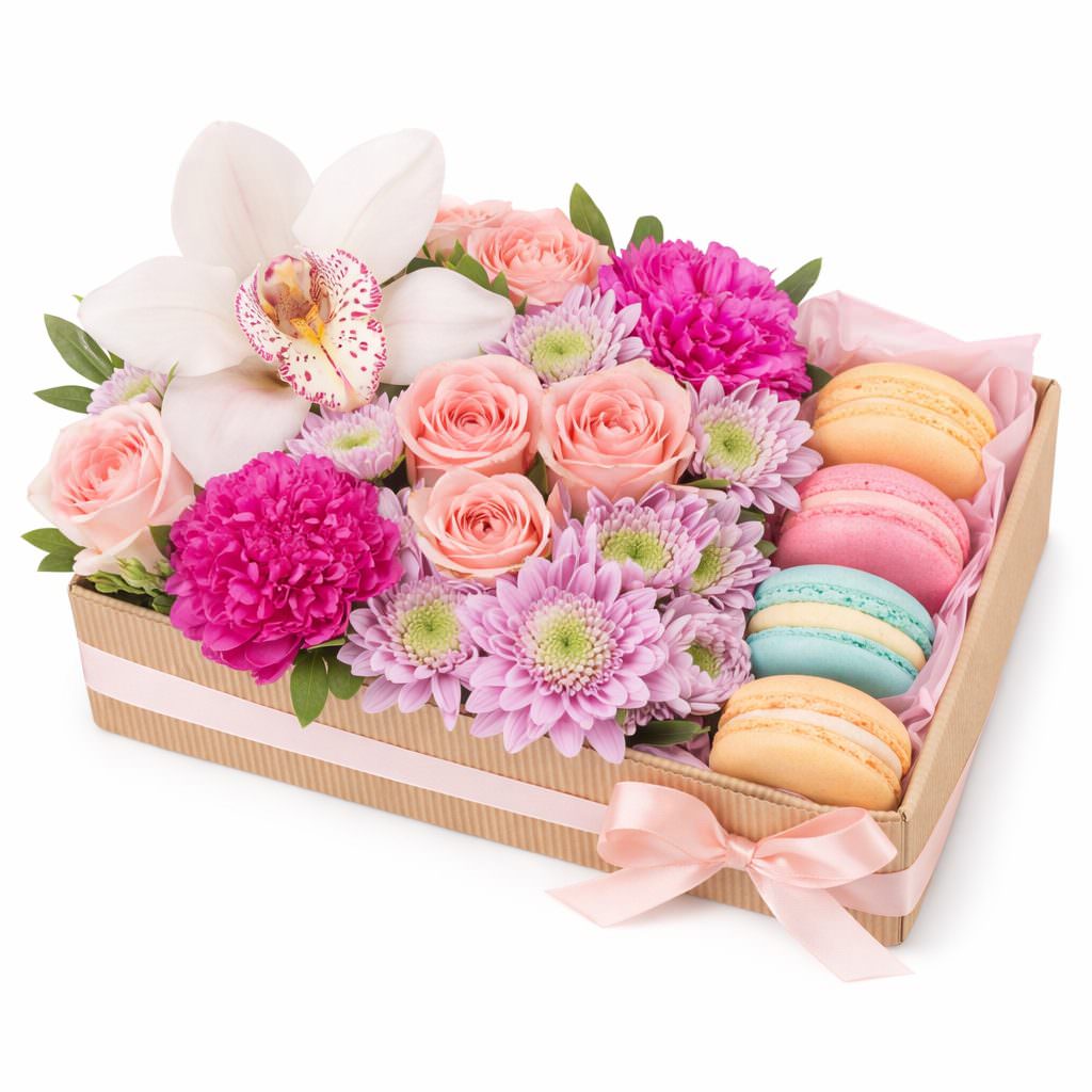 Эта яркая композиция в нежных пастельных тонах включает в себя белую орхидею, розовые одноголовые розы, сиреневые кустовые хризантемы и розовые пионы. Все цветы аккуратно расположены в коробке, добавляют изысканности макароны, которые сопровождают цветы. Такое оформление создаёт атмосферу уюта и изысканности. Подходит для подарка на долгожданную встречу для любимой женщины.