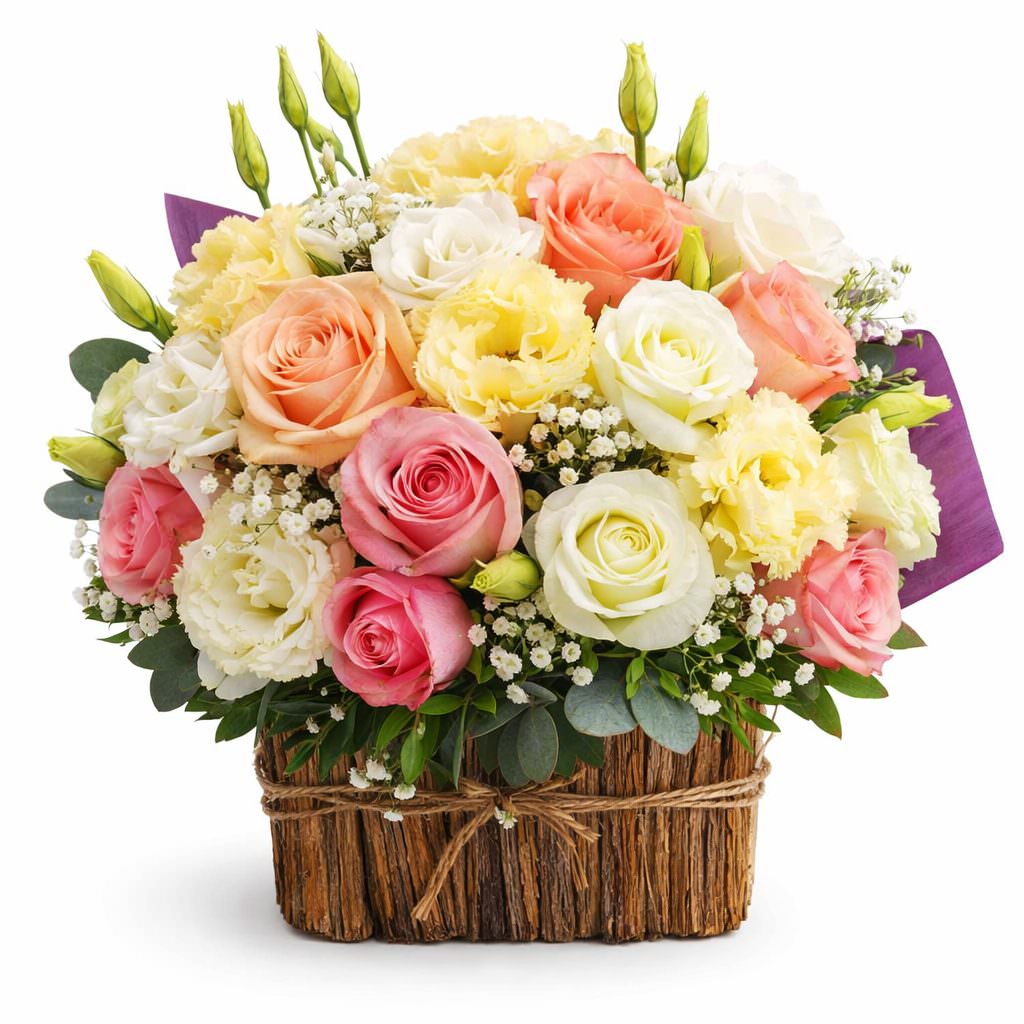 Яркая и жизнерадостная композиция в теплых тонах включает персиковые и розовые розы, белую эустому, желтую гвоздику, гипсофилу и эвкалипт. Все цветы аккуратно размещены в корзине, создавая атмосферу уюта и радости. Прекрасный подарок для встречи из поездки, который обязательно порадует вашу любимую женщину.