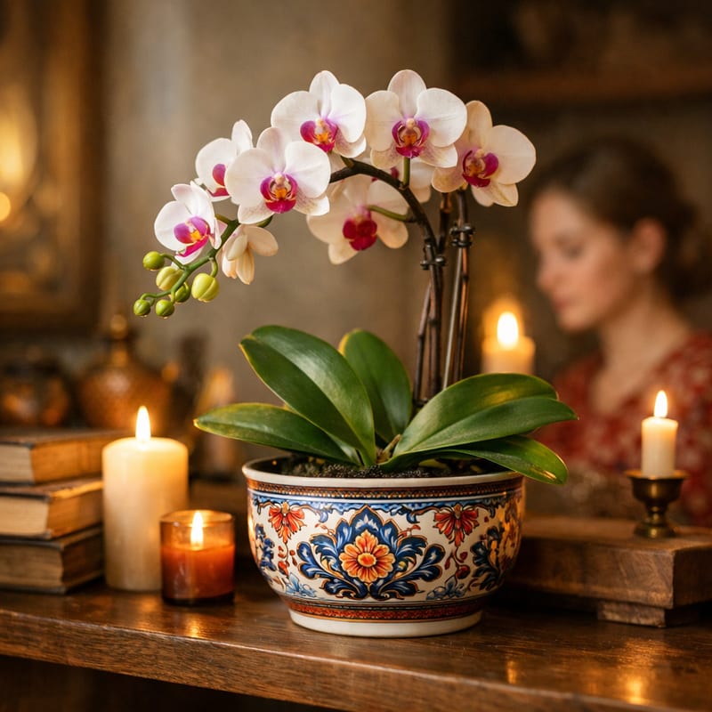Поливать раз в 7–10 дней методом погружения горшка в воду на 15 минут (не сверху!). Свет — рассеянный, без прямого солнца. Температура — 20–25°C, без сквозняков. Подкормка — раз в 2–3 недели специальным удобрением для орхидей. После цветения — обрезать стебель ниже первого узла, через 6–12 месяцев цветение повторится.